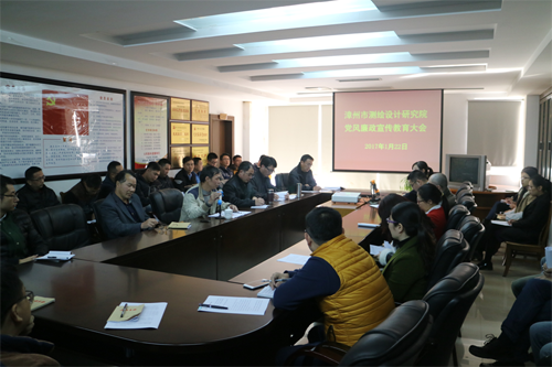 漳州市测绘设计研究院支部于2017年1月22日在院二楼党员活动室召开党风廉政宣传教育大会,会议由郑金水书记主持,全体党员及各科室负责人、技术骨干和作业组长参会。会议传达学习习近平总书记在十八届中央纪委七次全会上重要讲话《全面贯彻落实党的十八届六中全会精神 增强全面从严治党系统性创造性实效性》和十八届中央纪委七次全会公报内容,传达市纪委《关于2017年元旦春节期间做好党风廉洁建设有关工作的通知》和市纪委驻市住建局纪检组监察室《2017年春节廉洁过节提醒函》内容,营造风清气正的节日氛围,学习市纪委《关于2起党风廉政建设责任追究典型案例的通报》和《关于3起违反中央八项规定精神典型问题的通报》文件,并组织全院党员干部、班组长和技术骨干集中观看了中纪委推出的反腐系列片《打铁还需自身硬》中篇《严防灯下黑》,会后还将上篇《信任不能代替监督》、下篇《以担当诠释忠诚》上传至院信息化平台,全院干部职工下载收看和学习。