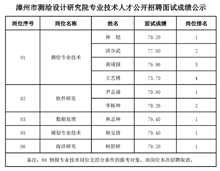 漳州市测绘设计研究院专业技术人才公开招聘面试成绩公示