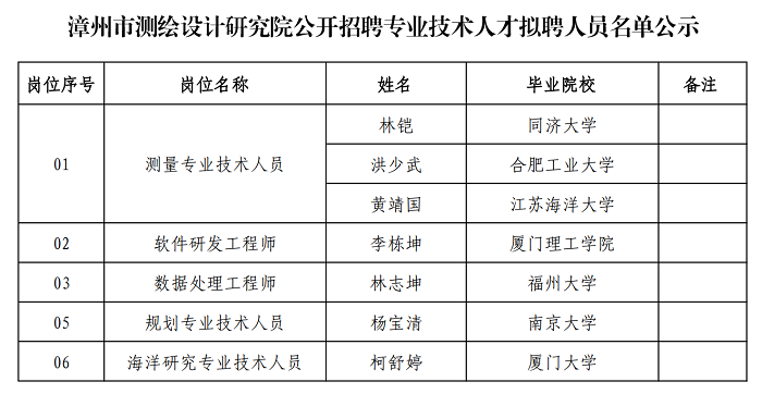 根据2023年6月《漳州市测绘设计研究院公开招聘专业技术人才公告》,通过报名、资格审查、面试考核、体检、政审等环节,拟聘以下同志为我院工作人员,现予公示。公示期间,如有问题,请及时向漳州市测绘设计研究院综合科反映。公示时间为2023.07.31-2023.08.06。