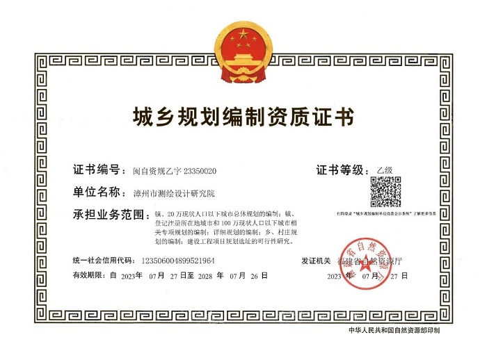 7月27日,经福建省自然资源厅审核认定,我院顺利获得城乡规划编制乙级资质。规划编制资质的取得,标志着我院拓宽服务领域又迈进了一步,对全院的发展具有重要意义。