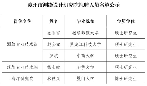 通过资格审核、面试考核、体检政审等环节,我院拟聘以下同志为我院工作人员,现予公示。公示期间,如有问题,请及时向漳州市测绘设计研究院综合科反映。公示时间为2024.09.29-2024.10.10。